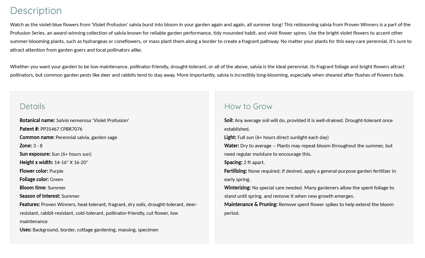 For each plant we offer, you'll find all the growing guidance you need right on its product page. Just scroll down to the bottom half of the page where you'll find three handy sections: Description, Details, and How to Grow.